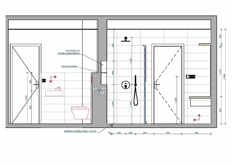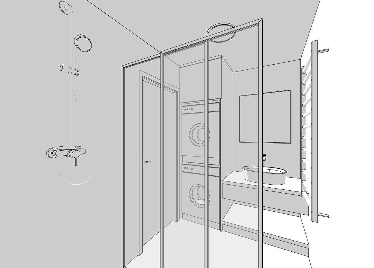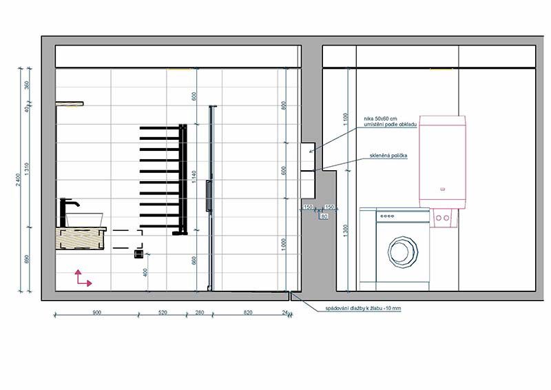 Varianta 1 - sprchový kout a pračka v technické místnosti