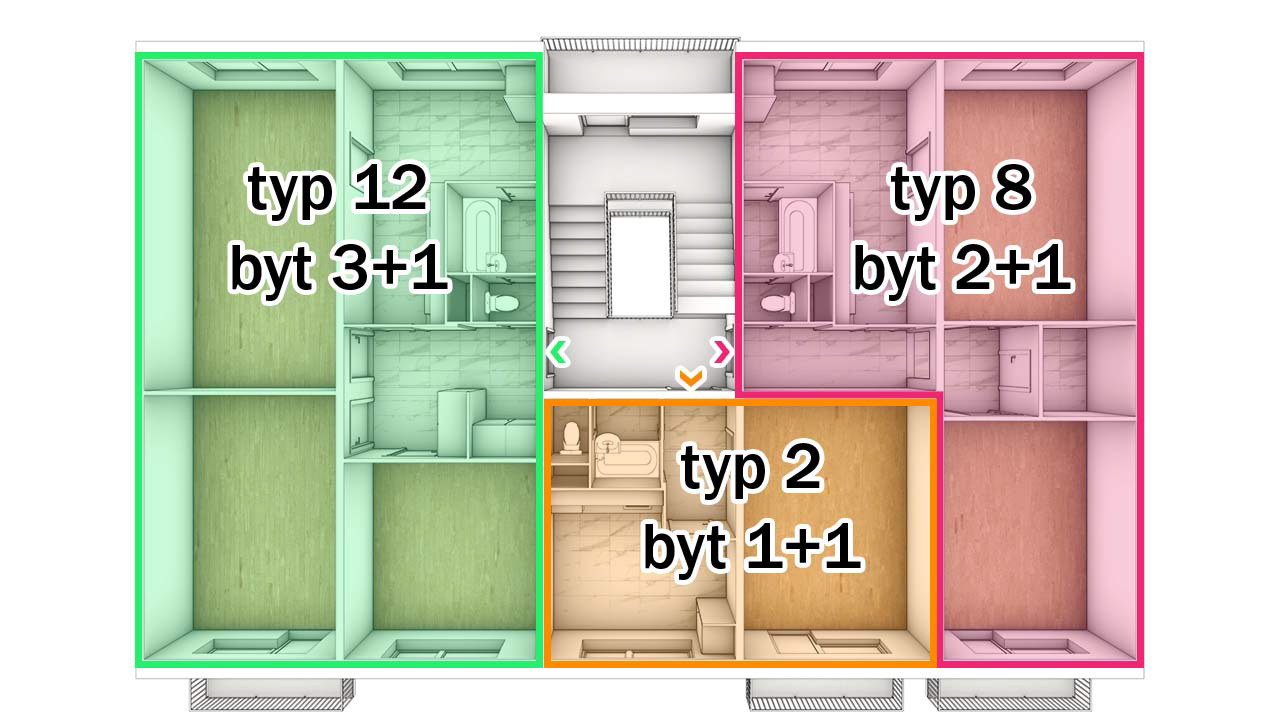 Typ 3: Malé byty 1+1, které mají bohužel jenom dvě okna, a tak další pokoj tam přidat nelze.