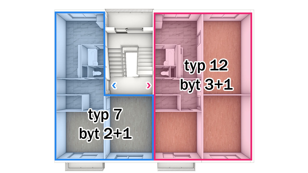 Povedlo se nám ale zpracovat i byt 3+1 (typ 12) a vytvořit byt 4+kk - hodné pro pětičlennou rodinu. Případně lze také vzniklou místnost navíc využít jako pracovnu - v tom případě by stačil pro byt jeden záchod.