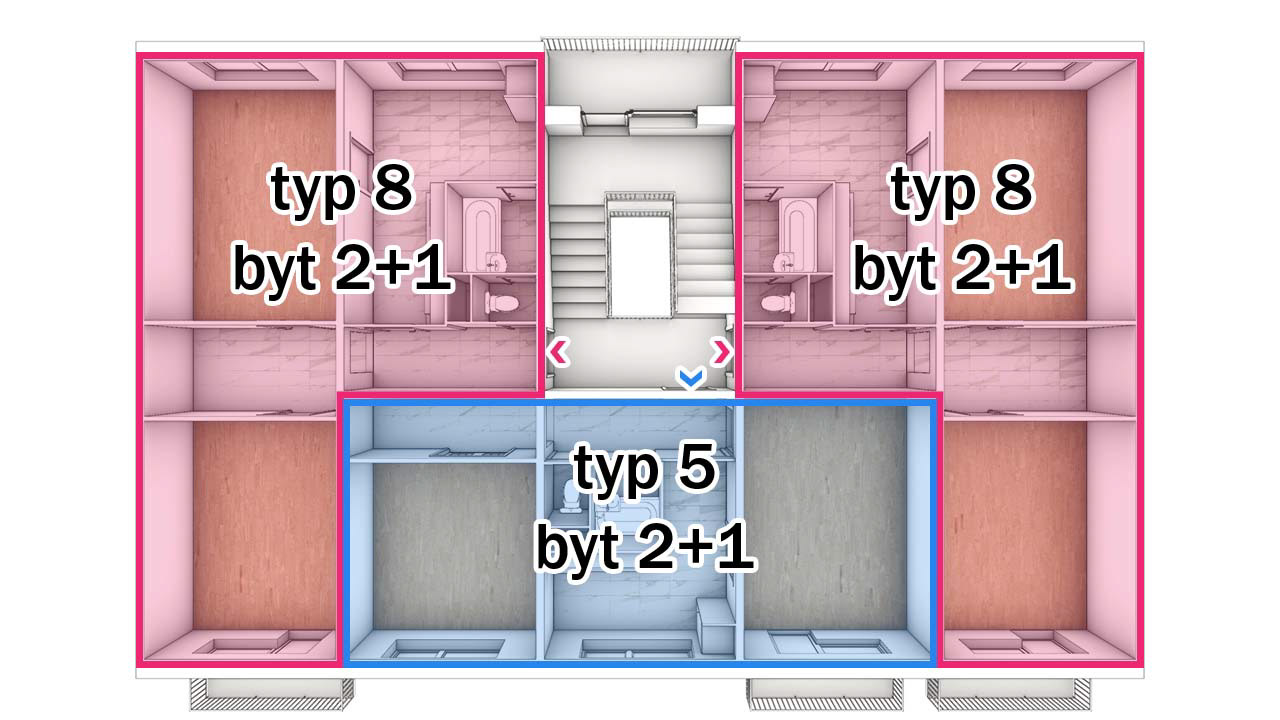 Typ 8: Ideální pro rozšíření. Byt má dispozici 2+1, přičemž mezi obývacím pokojem a ložnicí je chodba, kterou lze spojit s ložnicí.