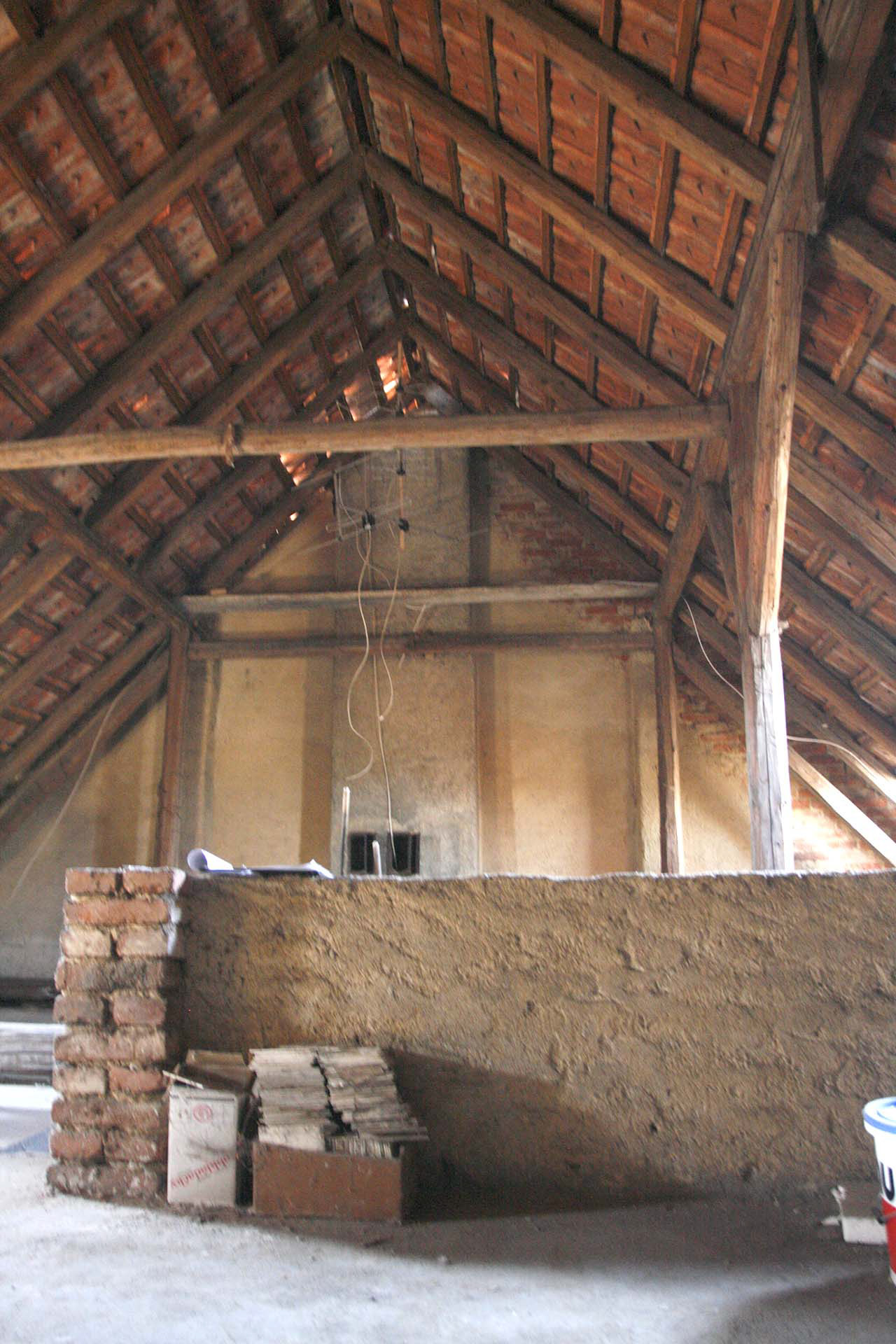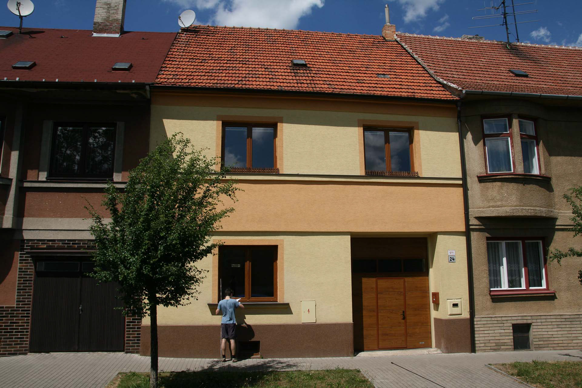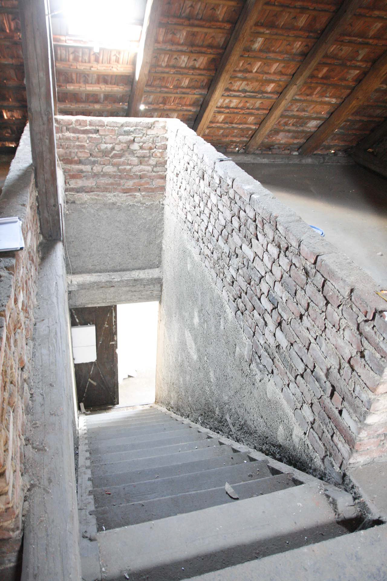 Tomuto domu z roku 1929 jsme museli vymyslet důstojné a bezpečné schodiště. To se podařilo díky tomu, že jsme pořádně propočítali výšky stupňů a schodiště rozdělili na 2 ramena s podestou. V patře vznikla jednoduchá dispozice s koupelnou, ložnicí a obývacím pokojem s kuchyní. Vzhledem k vysoké konstrukční výšce domu a vzhledem k tomu, že v domě žijí malé děti, jsme stejnou fintu s rozdělením schodiště použili i do obytného podkroví. Tam vznikl prostor pro koupelnu, 2 pokoje a balkon. Přízemní byt přístupný z garáže jsme upravili do dispozice 2+kk.