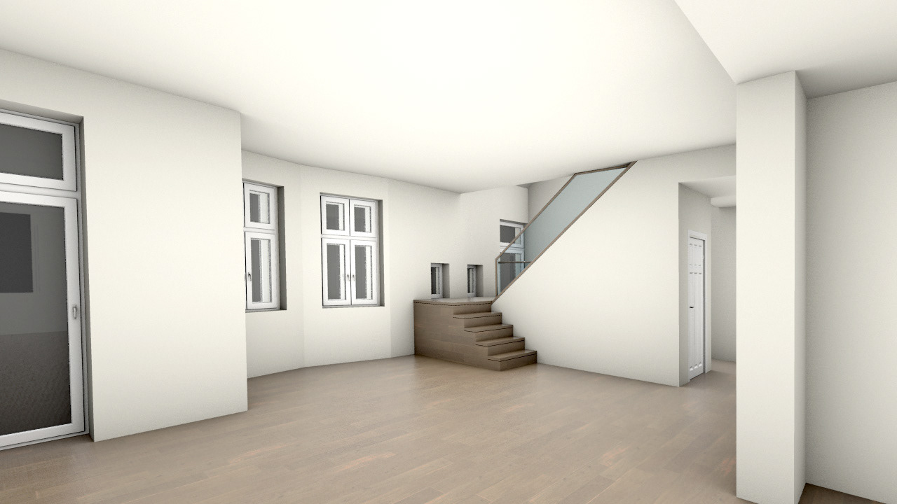 Rekonstrukce tohoto domu spočívala ve vytvoření obytného prostoru v přízemí a půdní vestavby v patře. Srdcem každého domu je schodiště. Ve starých domech bývají schodiště vedoucí na půdu velmi příkrá, křivočará a nejsou podle vzorce. Abychom zajistili bezpečnost, rozdělili jsme původní jednoramenné schodiště na 2 ramena s podestou. Rádi pracujeme s variantami. Pro tento dům jsme navrhli 2 rovnocenné varianty přístupu do podkroví. Jedna byla ze vstupní haly a druhá z obývacího pokoje. Klientka si nakonec vybrala variantu 2, které se lépe hodila k její představě kompaktnosti bydlení.