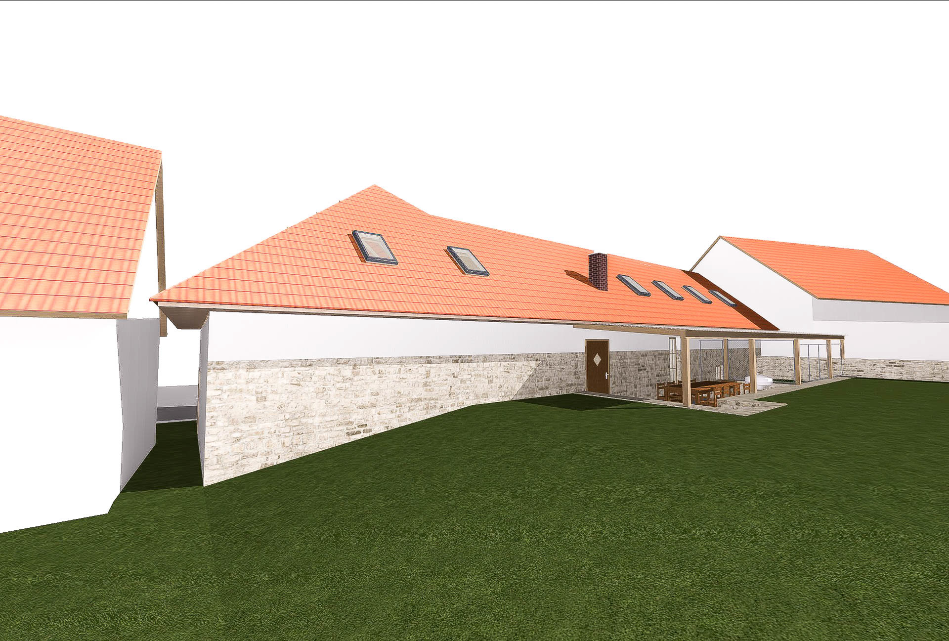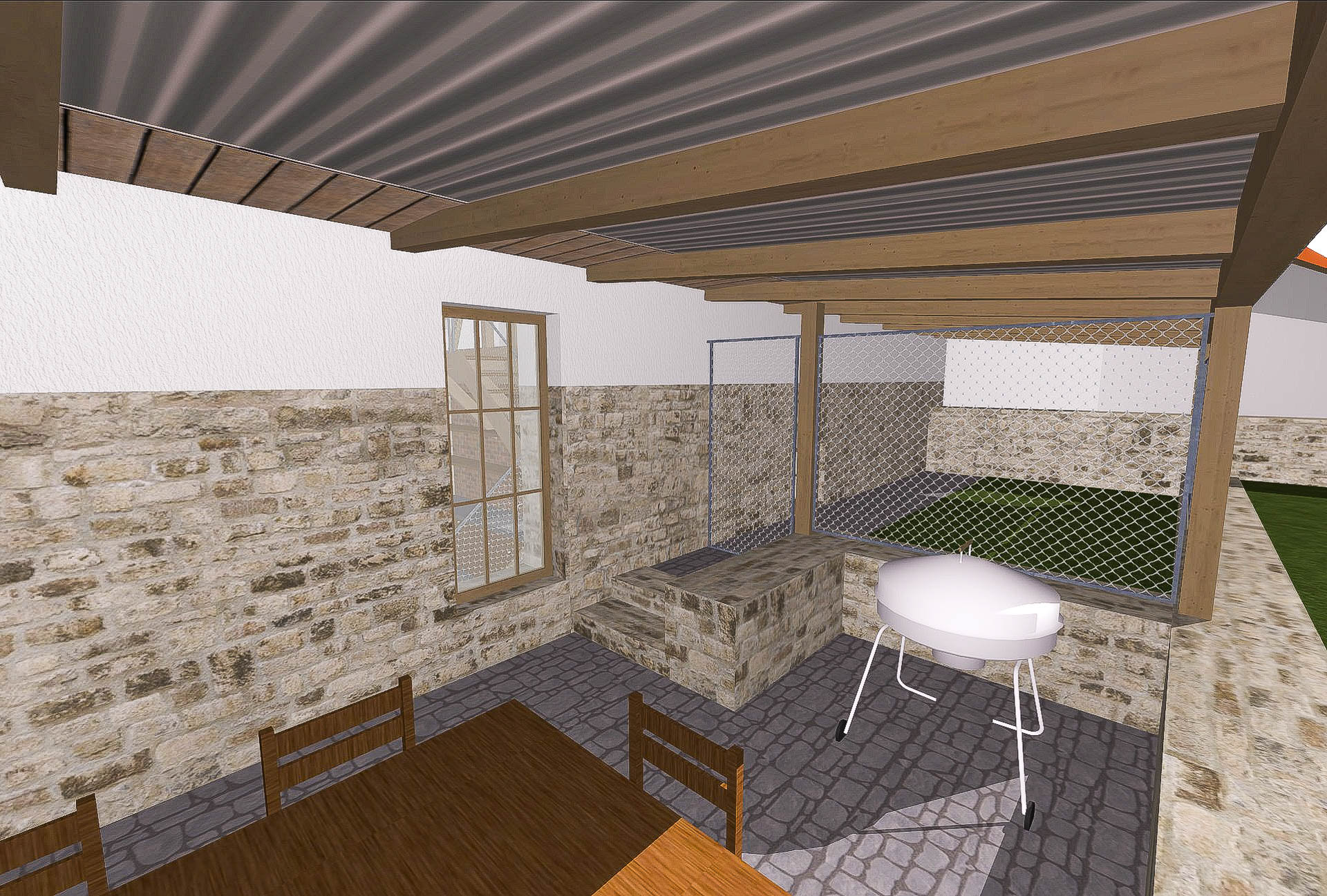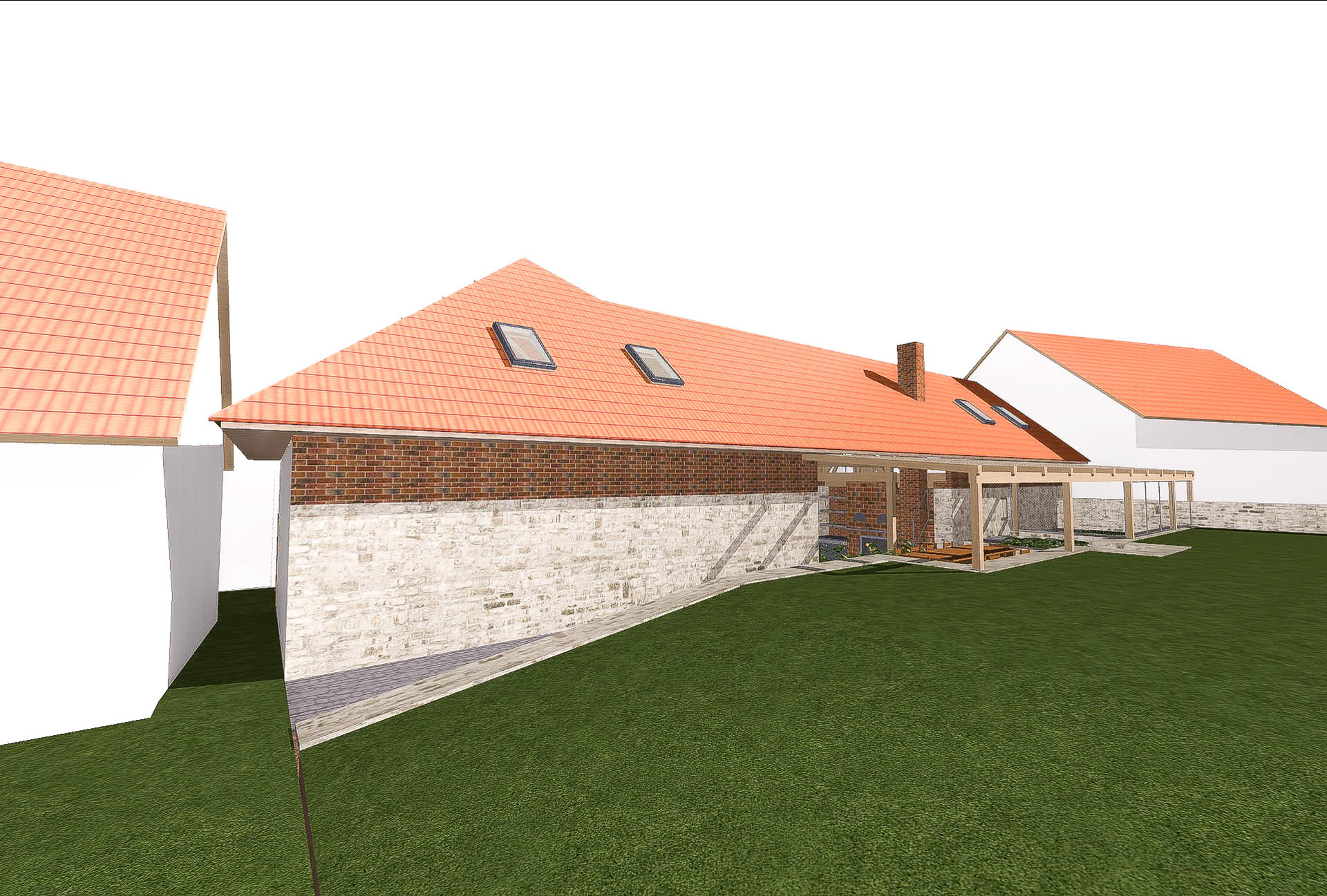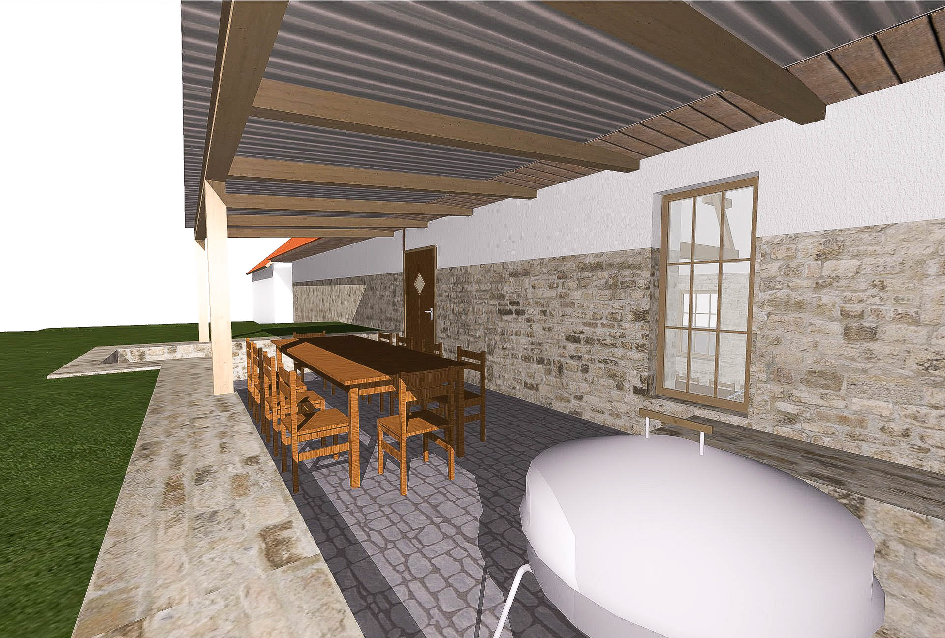 Součástí návrhu je i letní kuchyně a velkorysé ohniště s možností opékání, uzení nebo pečení pizzy. Zvolené materiály jsou v souladu s původní stavbou – staré cihly a kámen ze zbouraných částí, aby prostor působil přirozeně a autenticky.