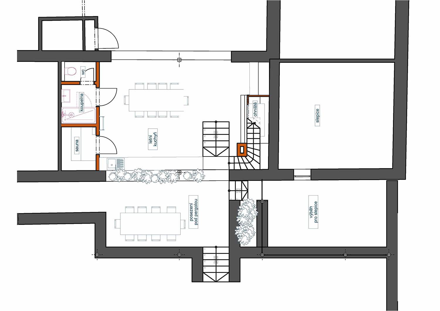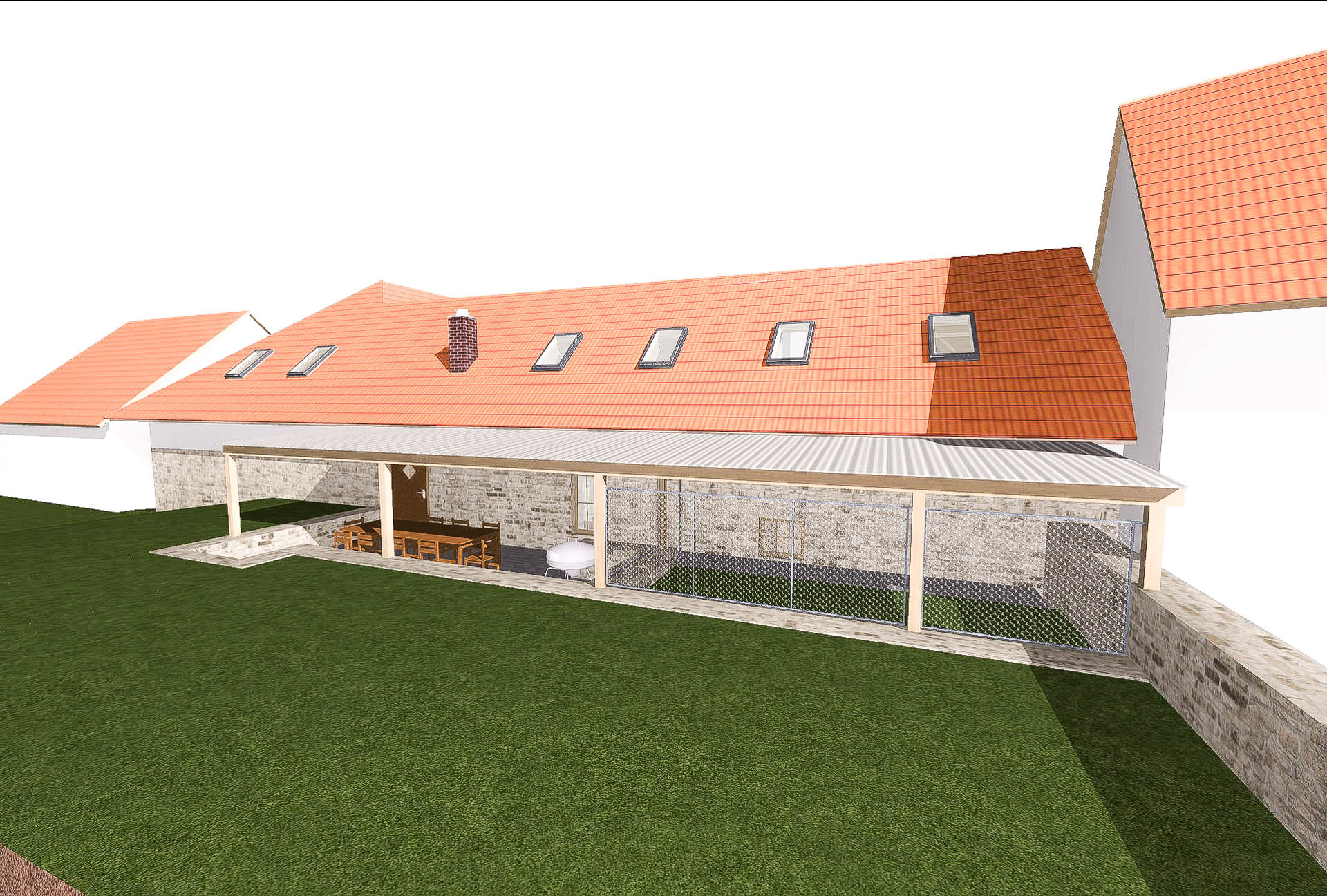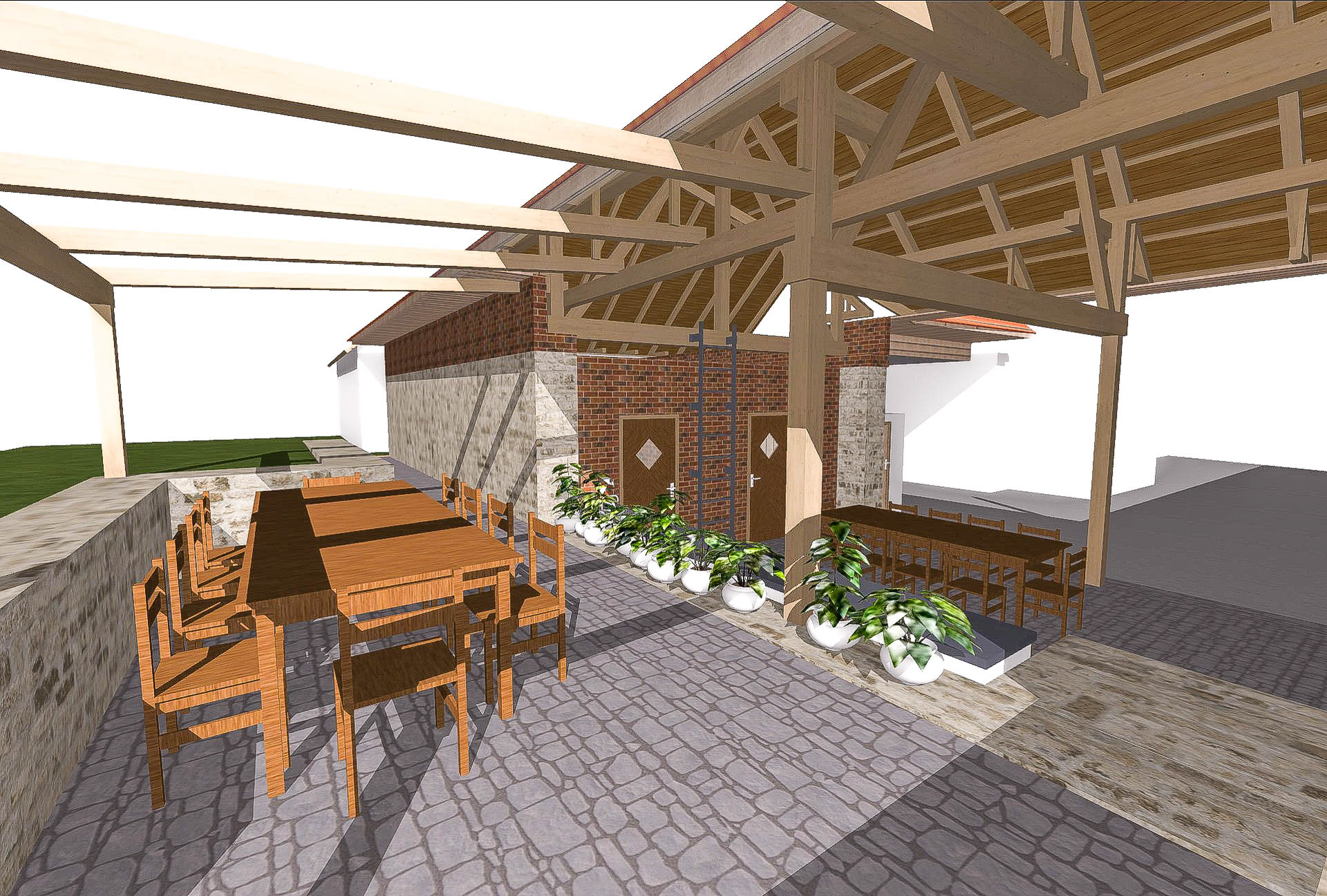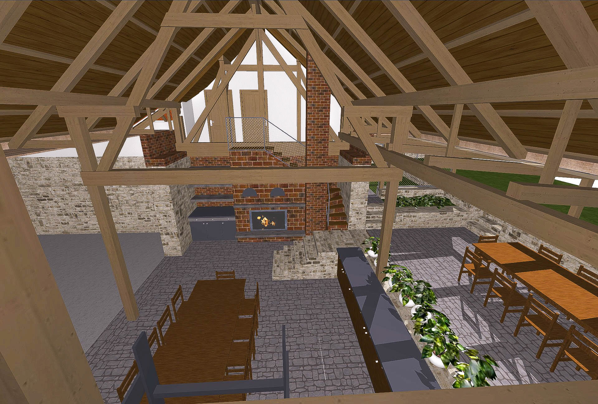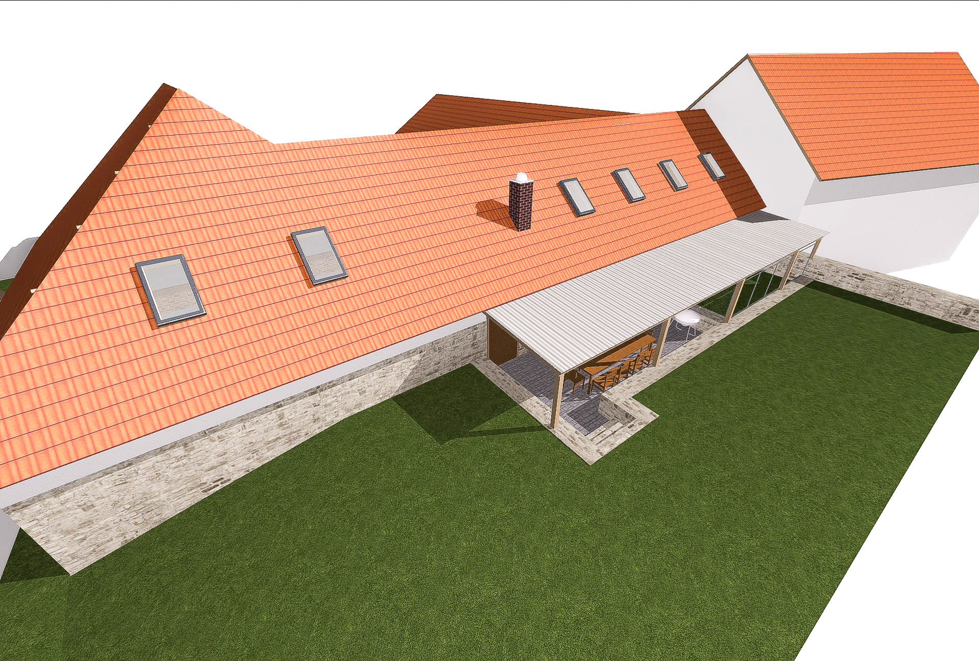 Součástí návrhu je i letní kuchyně a velkorysé ohniště s možností opékání, uzení nebo pečení pizzy. Zvolené materiály jsou v souladu s původní stavbou – staré cihly a kámen ze zbouraných částí, aby prostor působil přirozeně a autenticky.