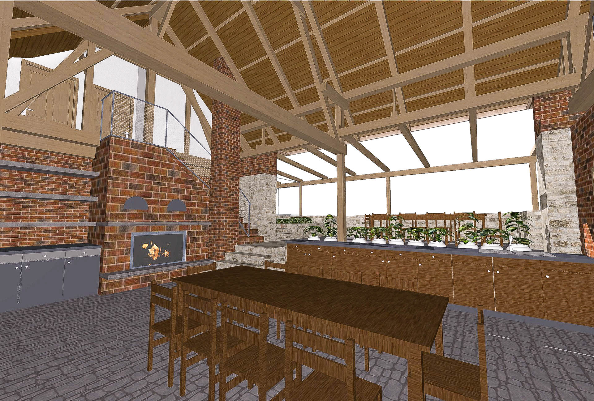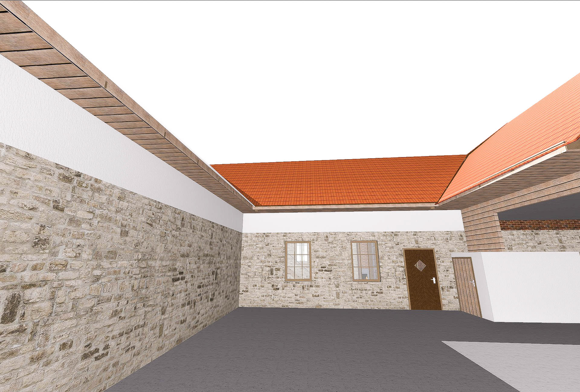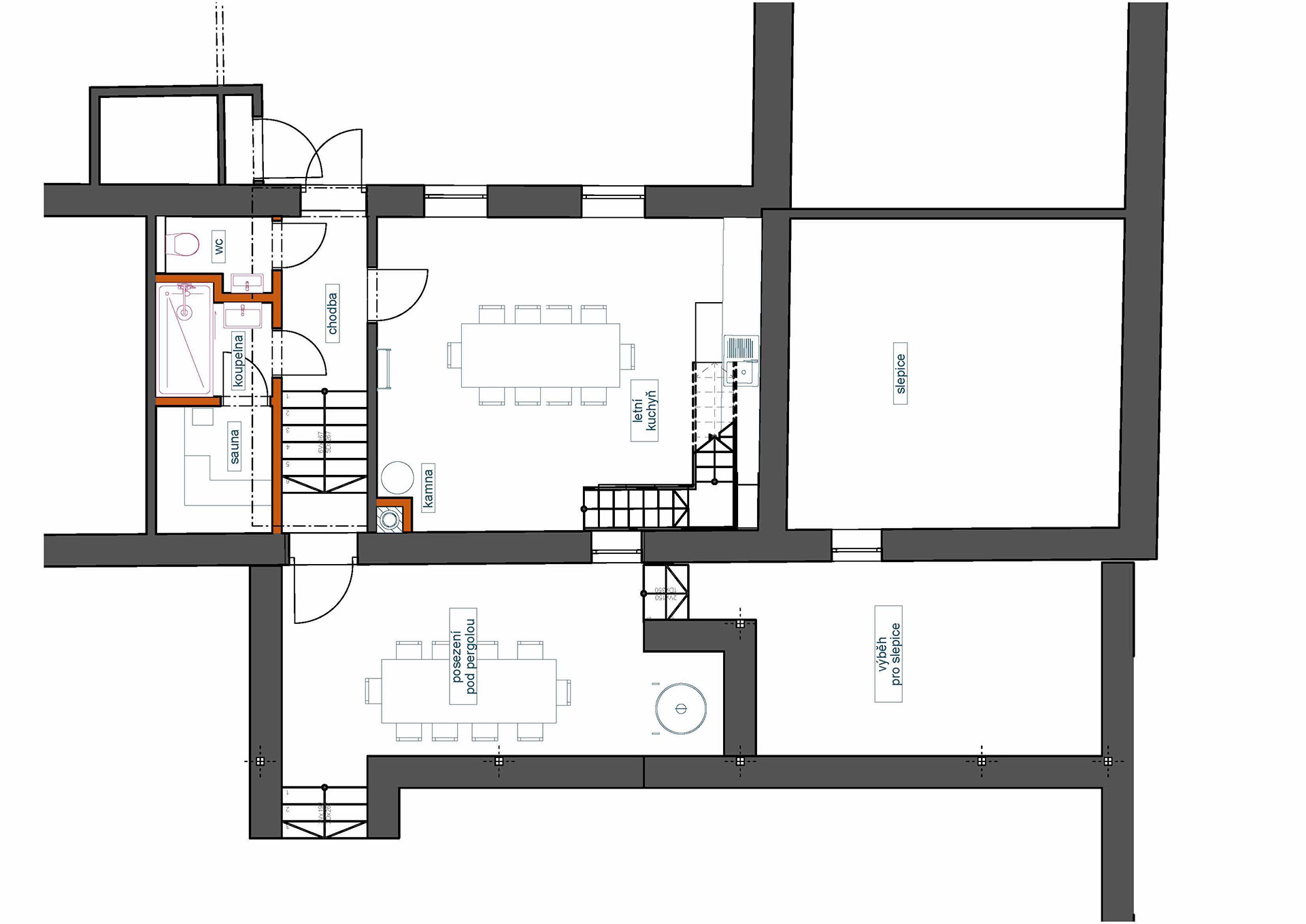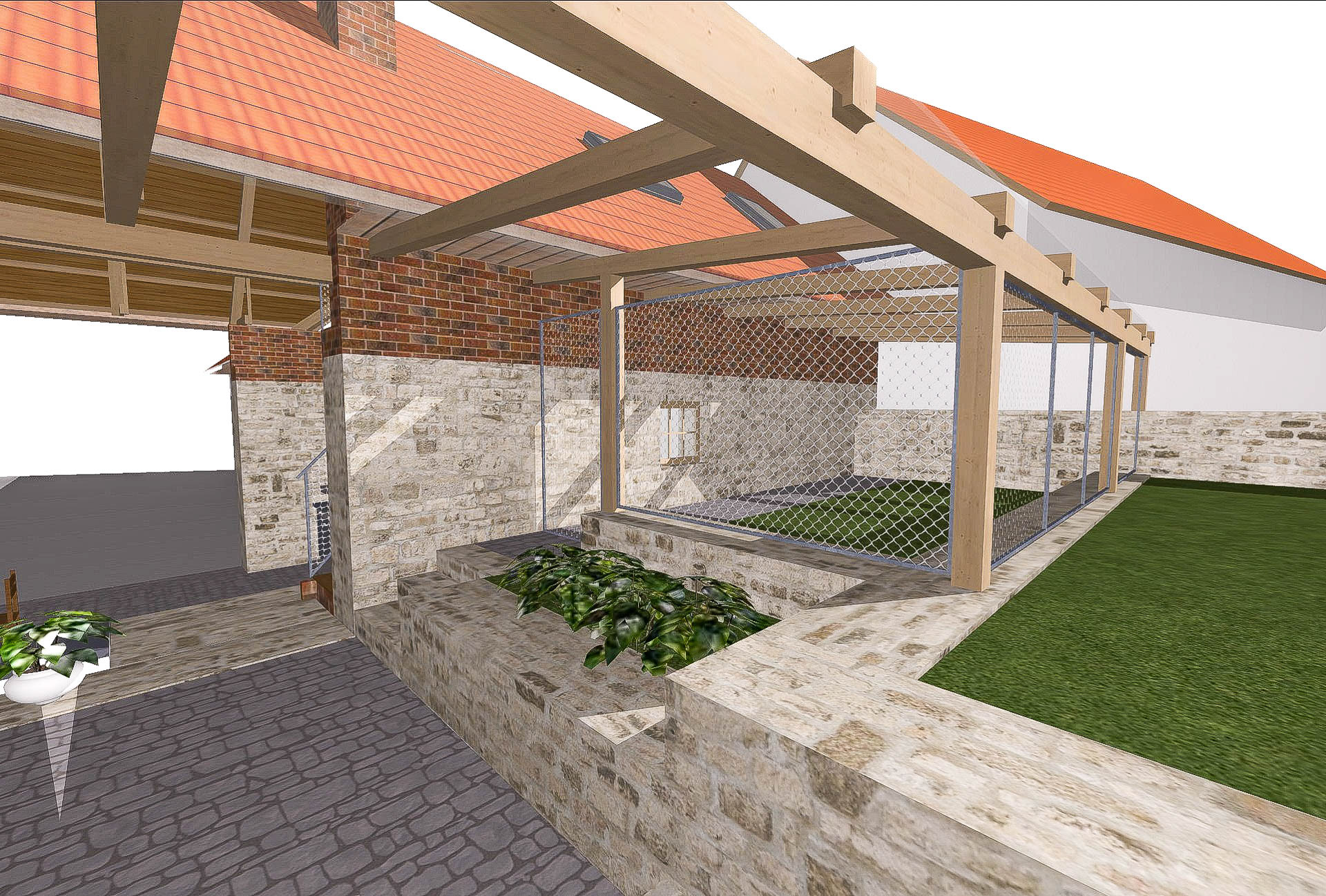 Součástí návrhu je i letní kuchyně a velkorysé ohniště s možností opékání, uzení nebo pečení pizzy. Zvolené materiály jsou v souladu s původní stavbou – staré cihly a kámen ze zbouraných částí, aby prostor působil přirozeně a autenticky.