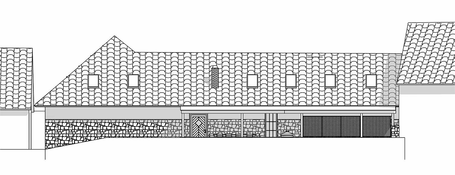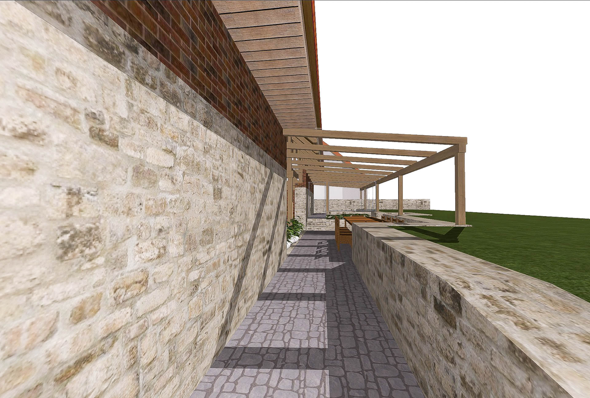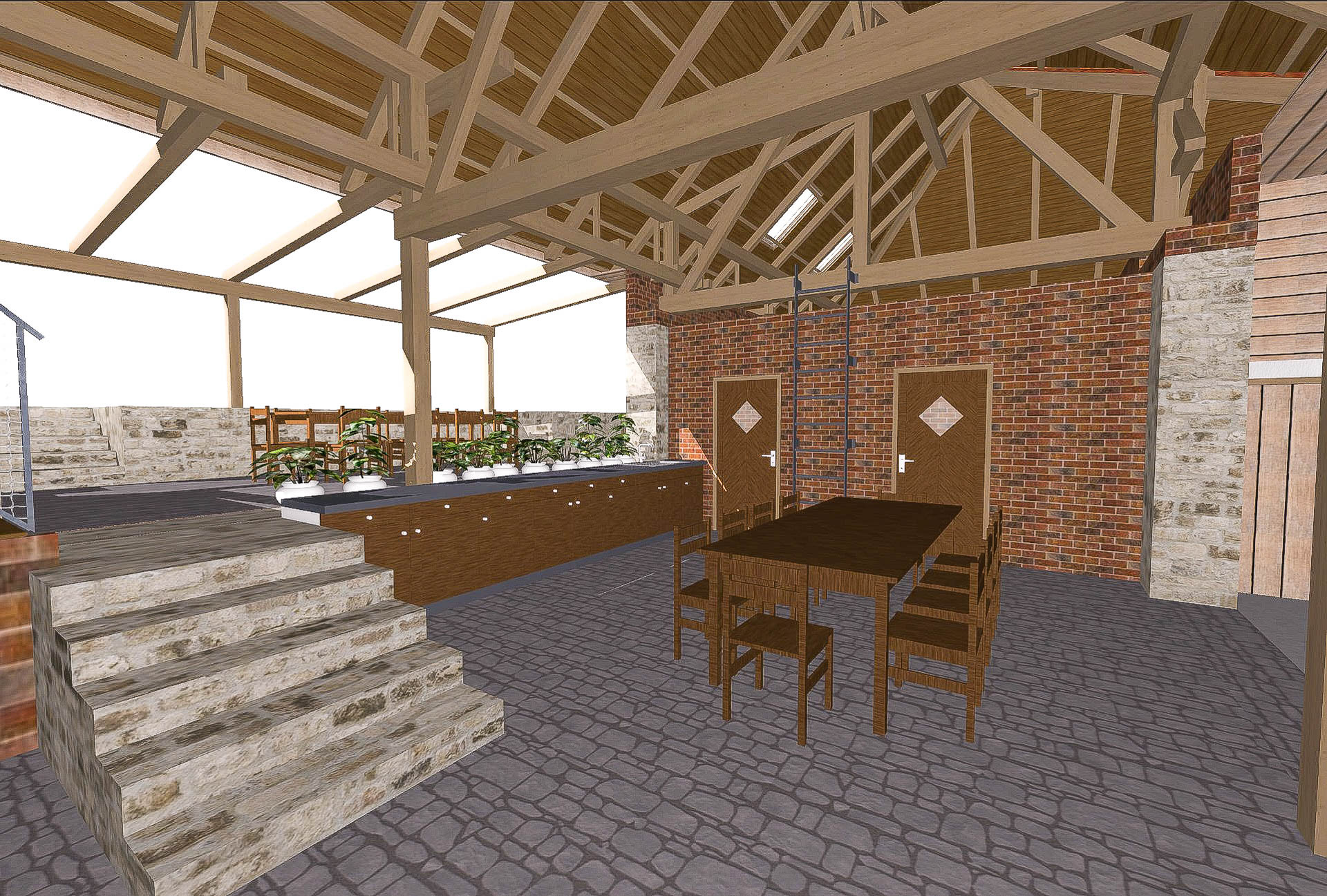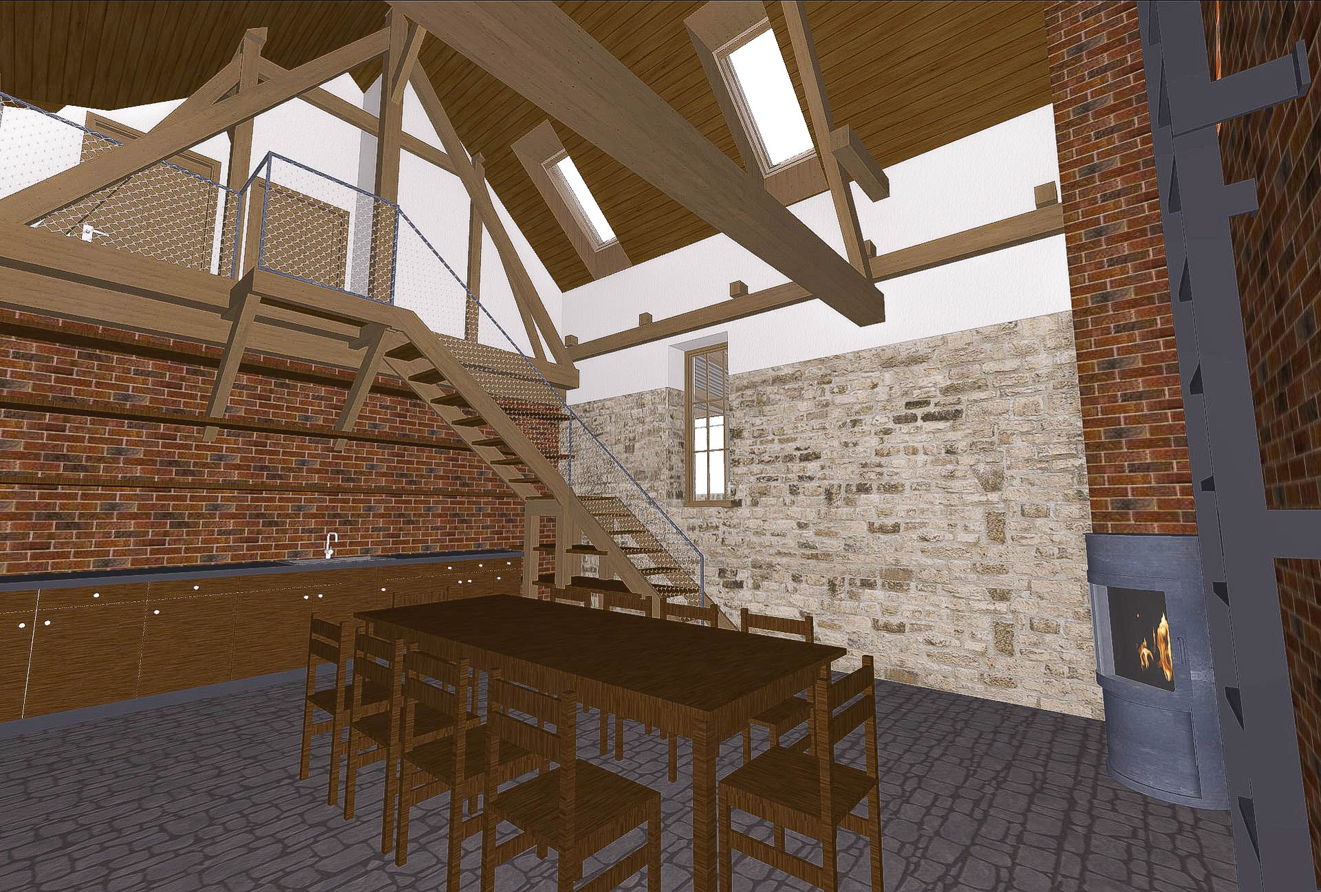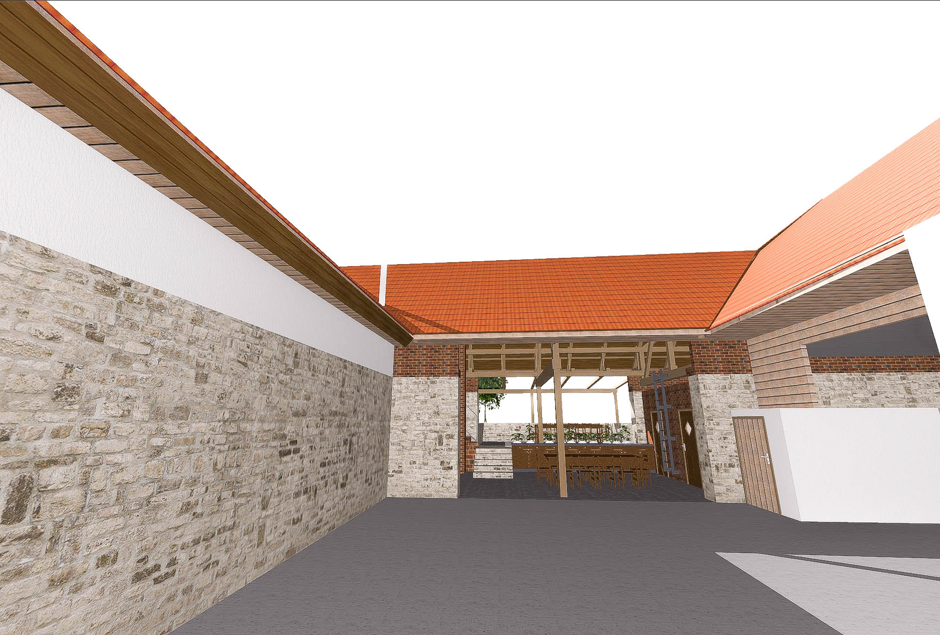 Součástí návrhu je i letní kuchyně a velkorysé ohniště s možností opékání, uzení nebo pečení pizzy. Zvolené materiály jsou v souladu s původní stavbou – staré cihly a kámen ze zbouraných částí, aby prostor působil přirozeně a autenticky.