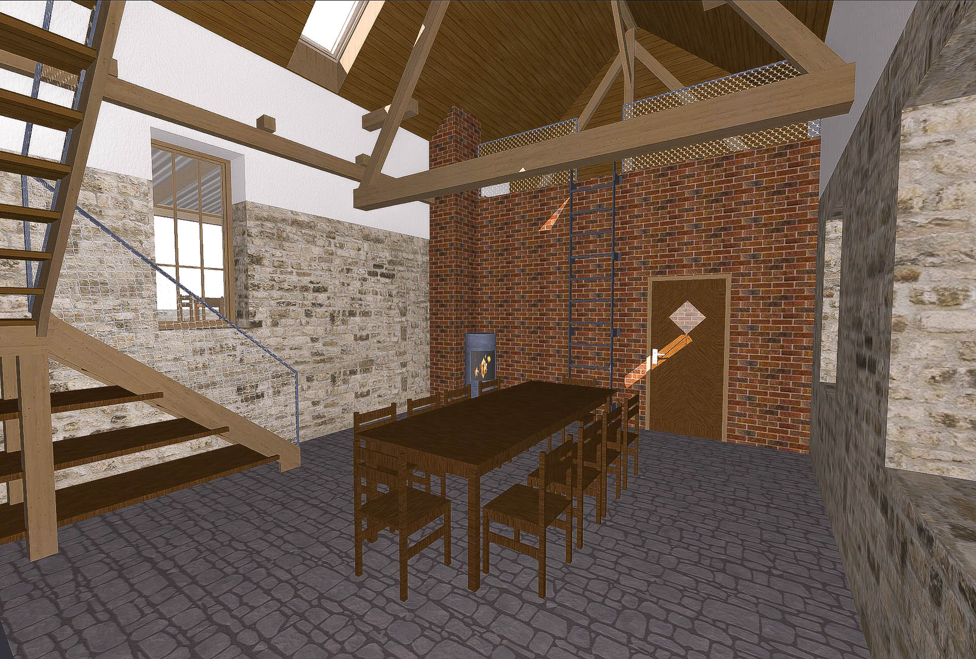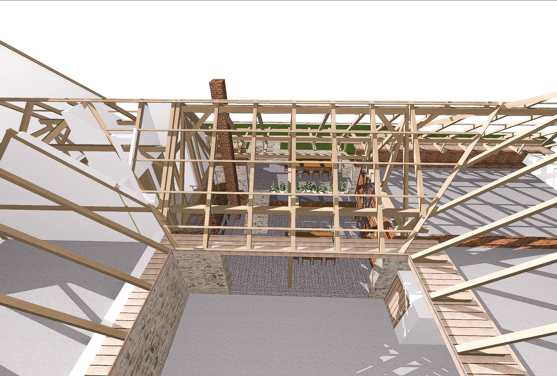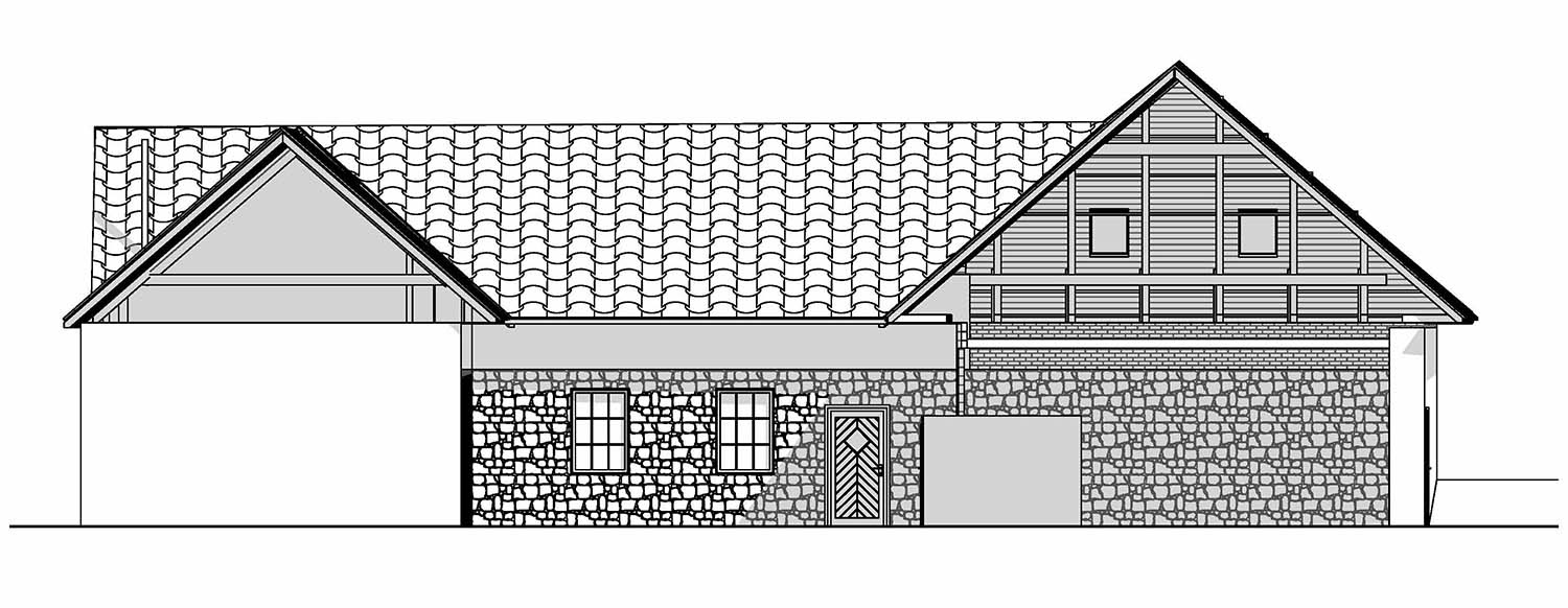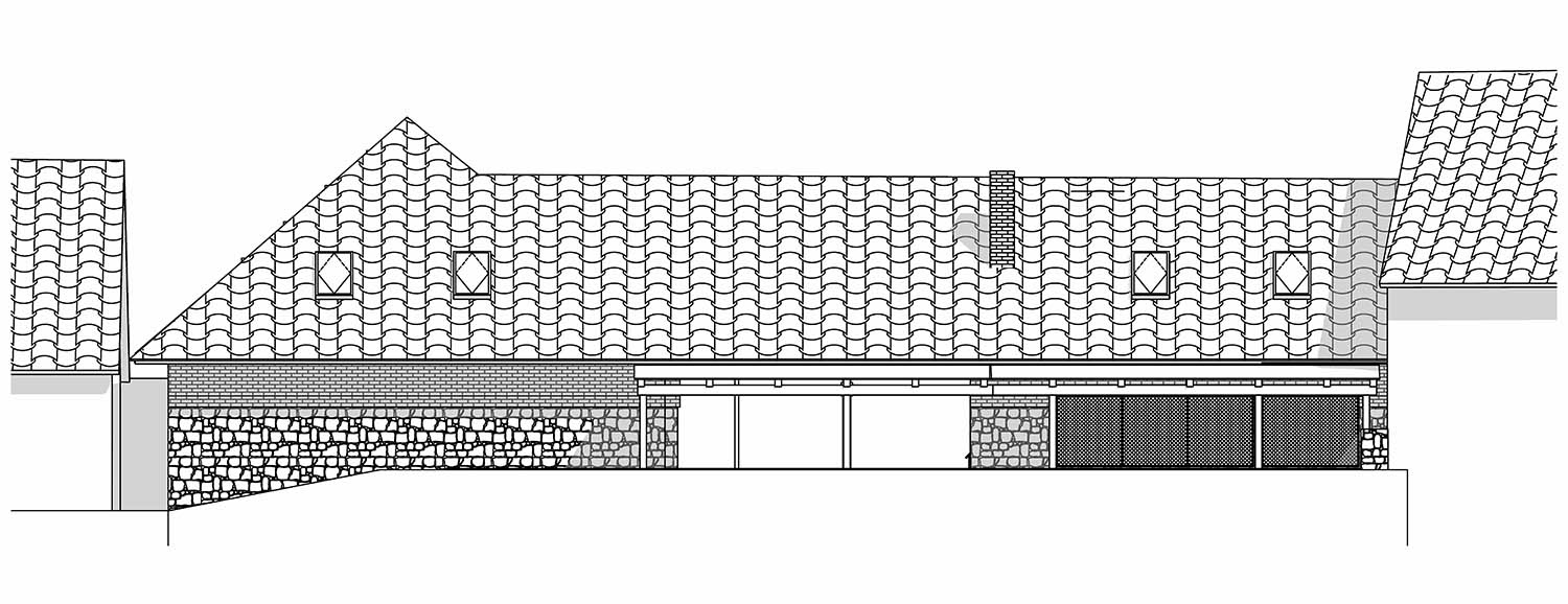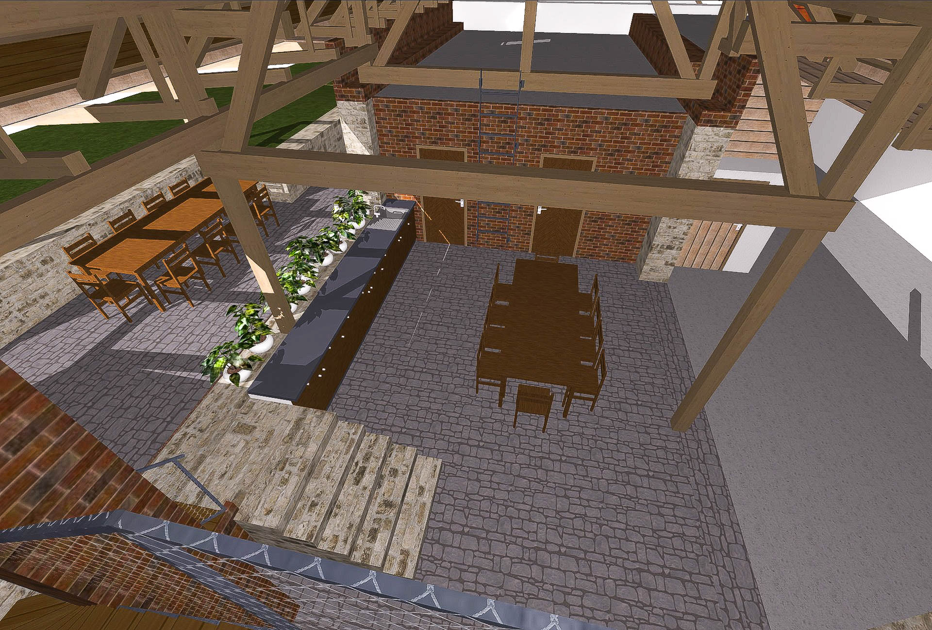Součástí návrhu je i letní kuchyně a velkorysé ohniště s možností opékání, uzení nebo pečení pizzy. Zvolené materiály jsou v souladu s původní stavbou – staré cihly a kámen ze zbouraných částí, aby prostor působil přirozeně a autenticky.