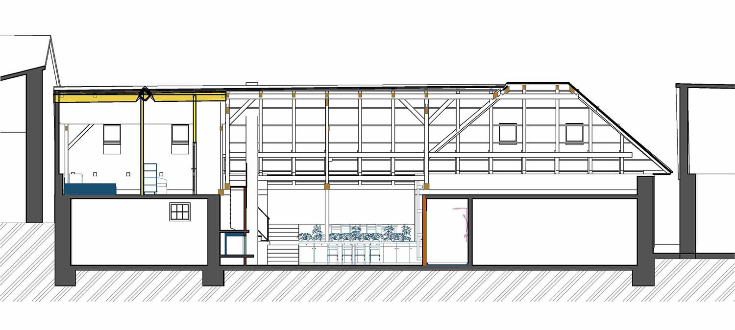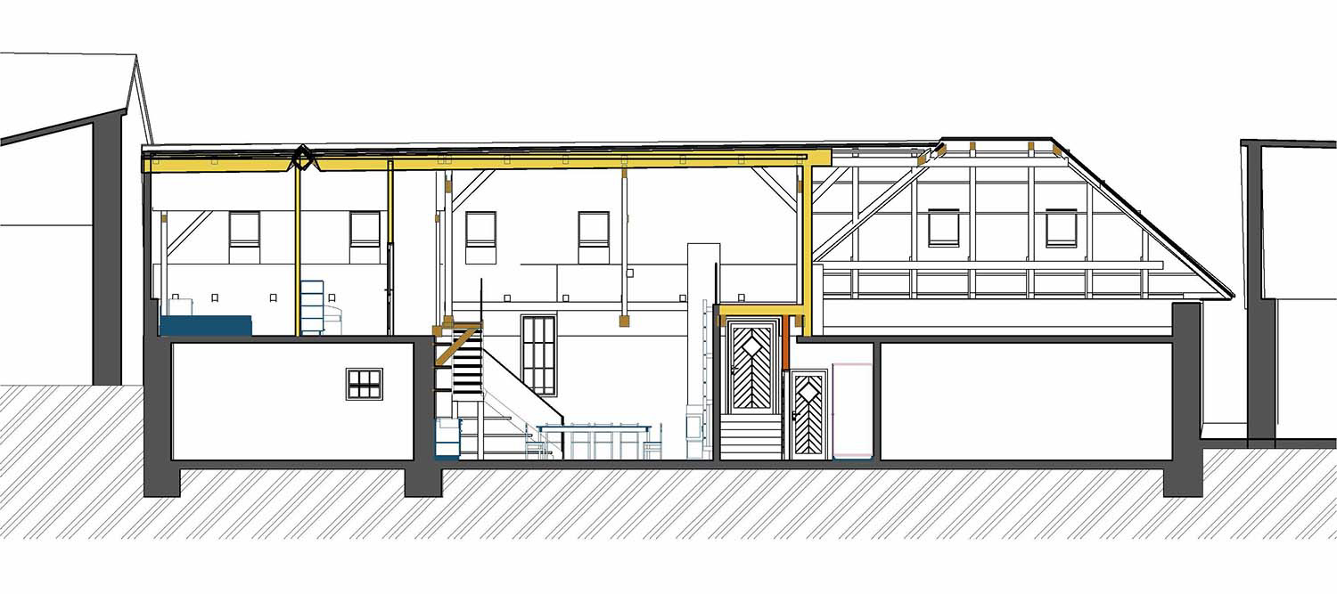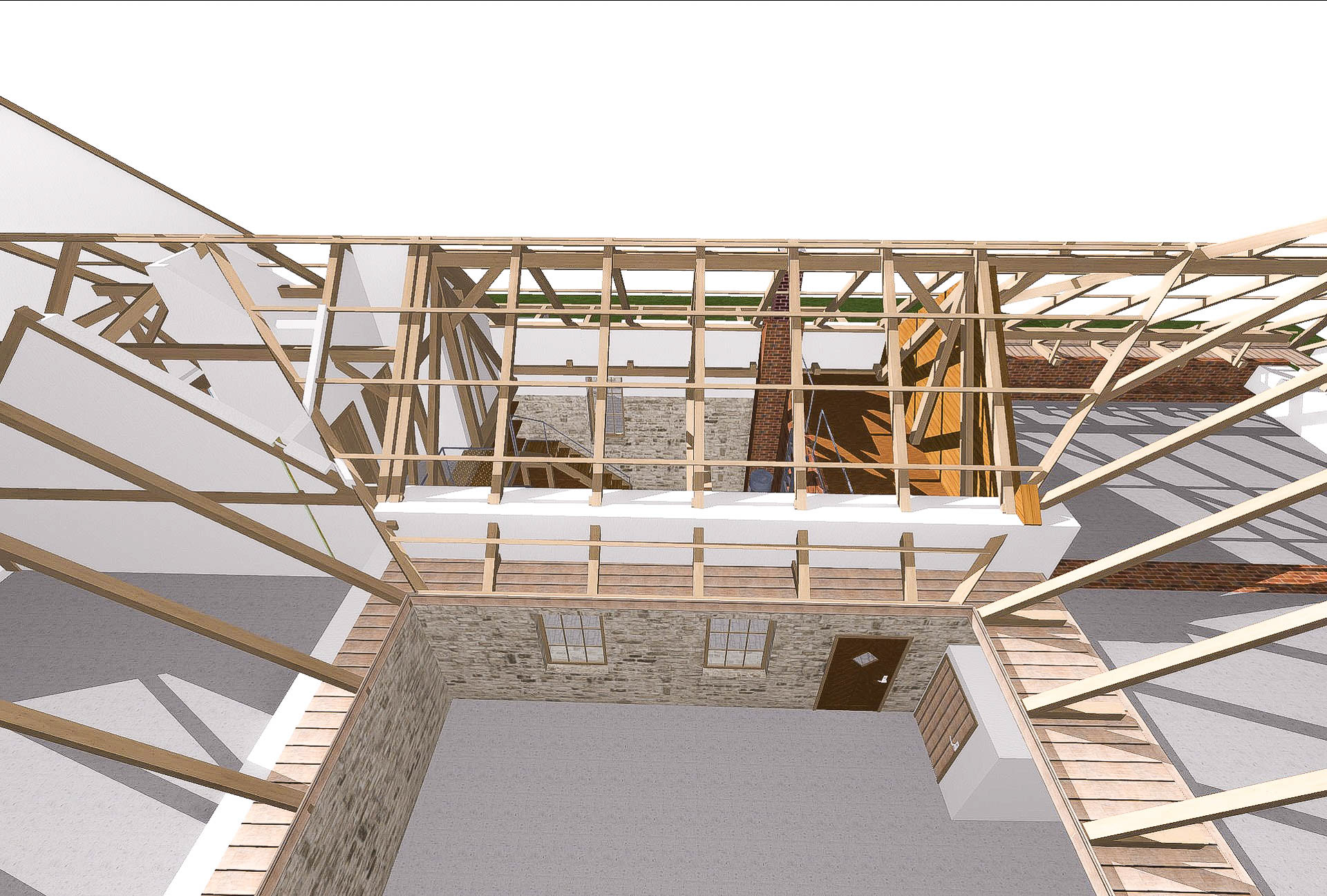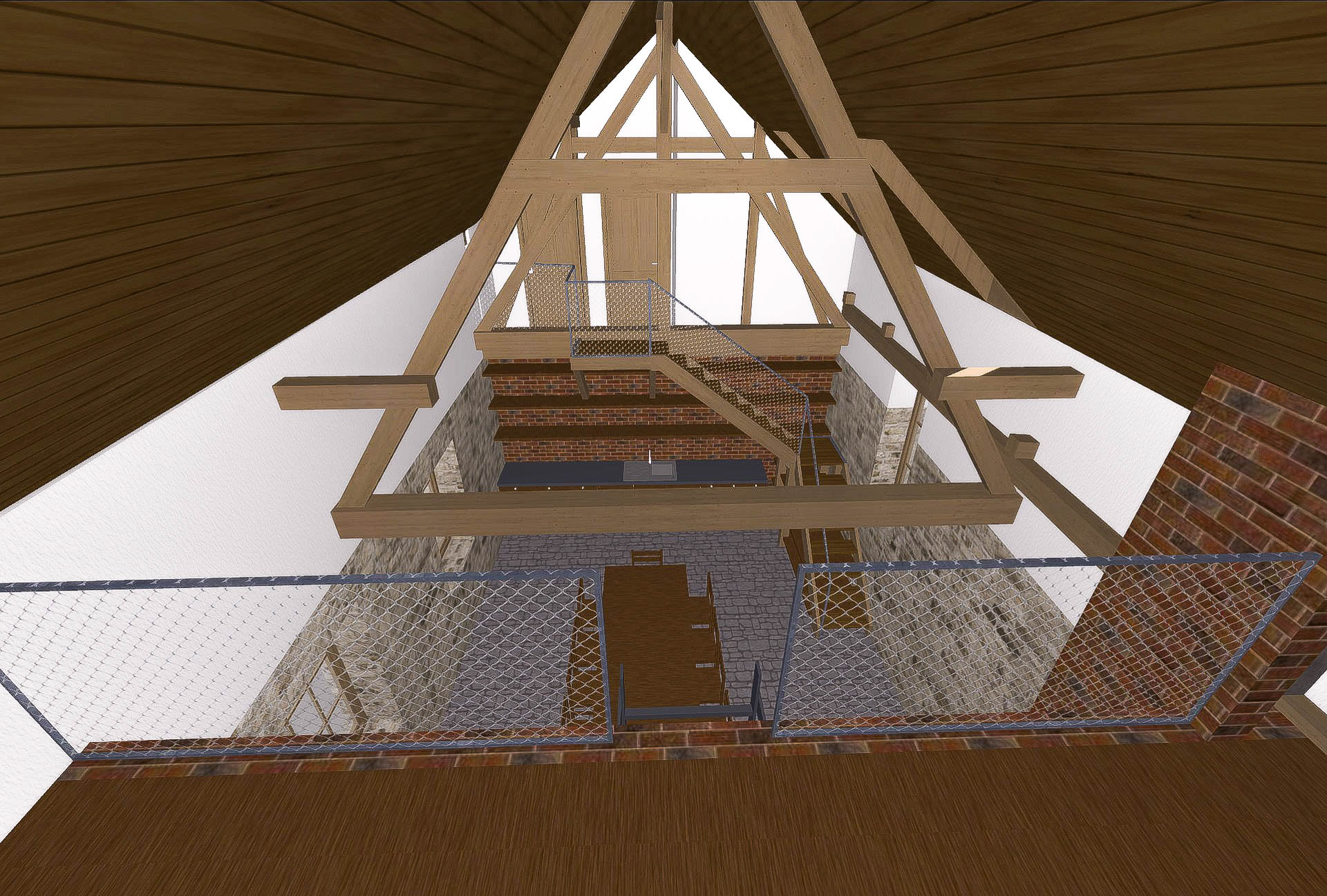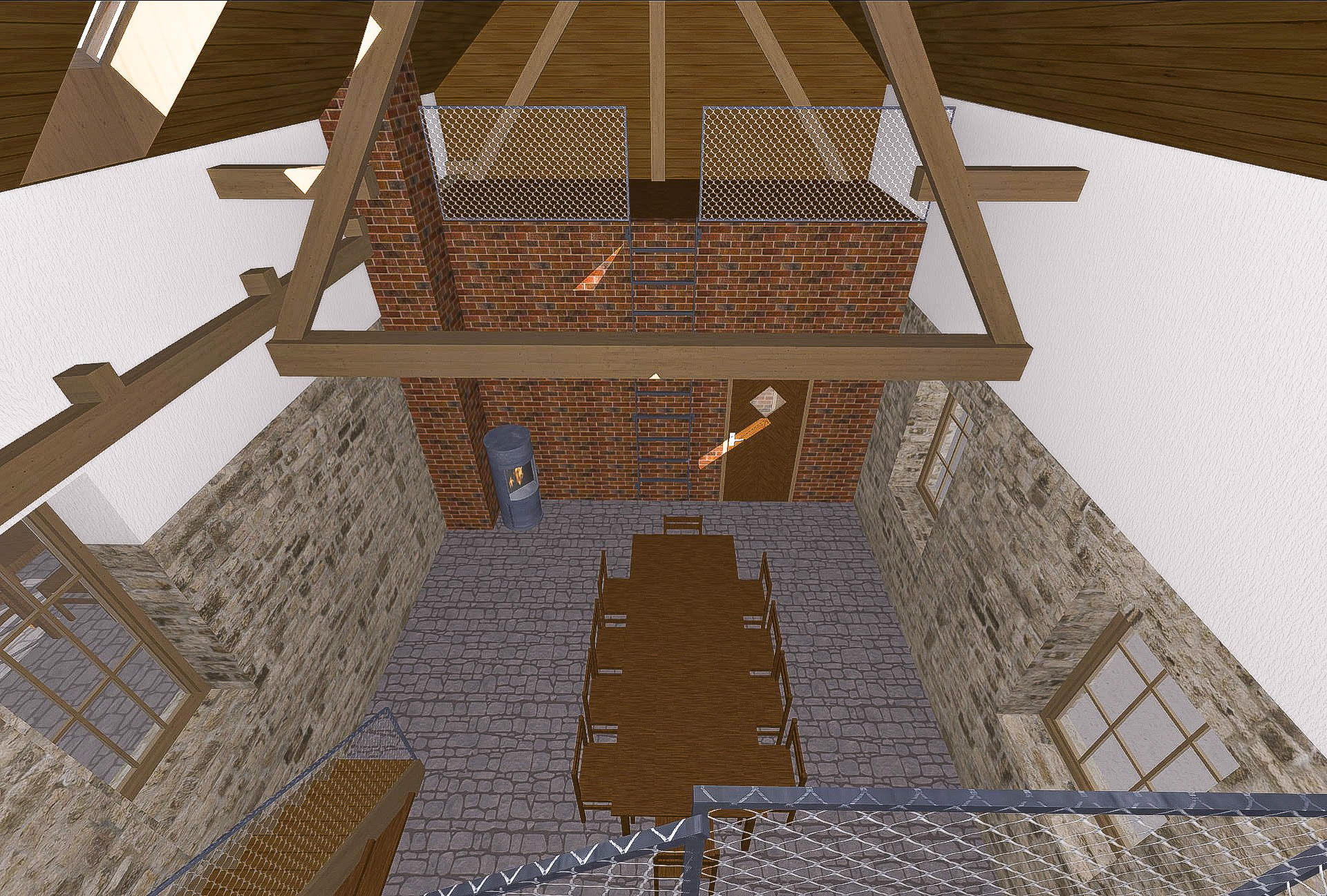 Součástí návrhu je i letní kuchyně a velkorysé ohniště s možností opékání, uzení nebo pečení pizzy. Zvolené materiály jsou v souladu s původní stavbou – staré cihly a kámen ze zbouraných částí, aby prostor působil přirozeně a autenticky.