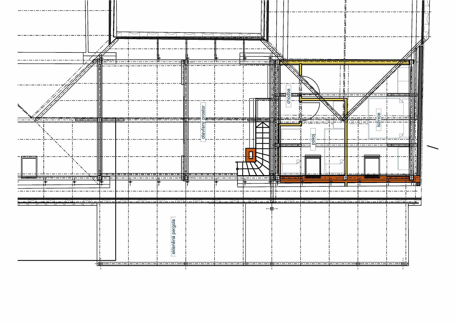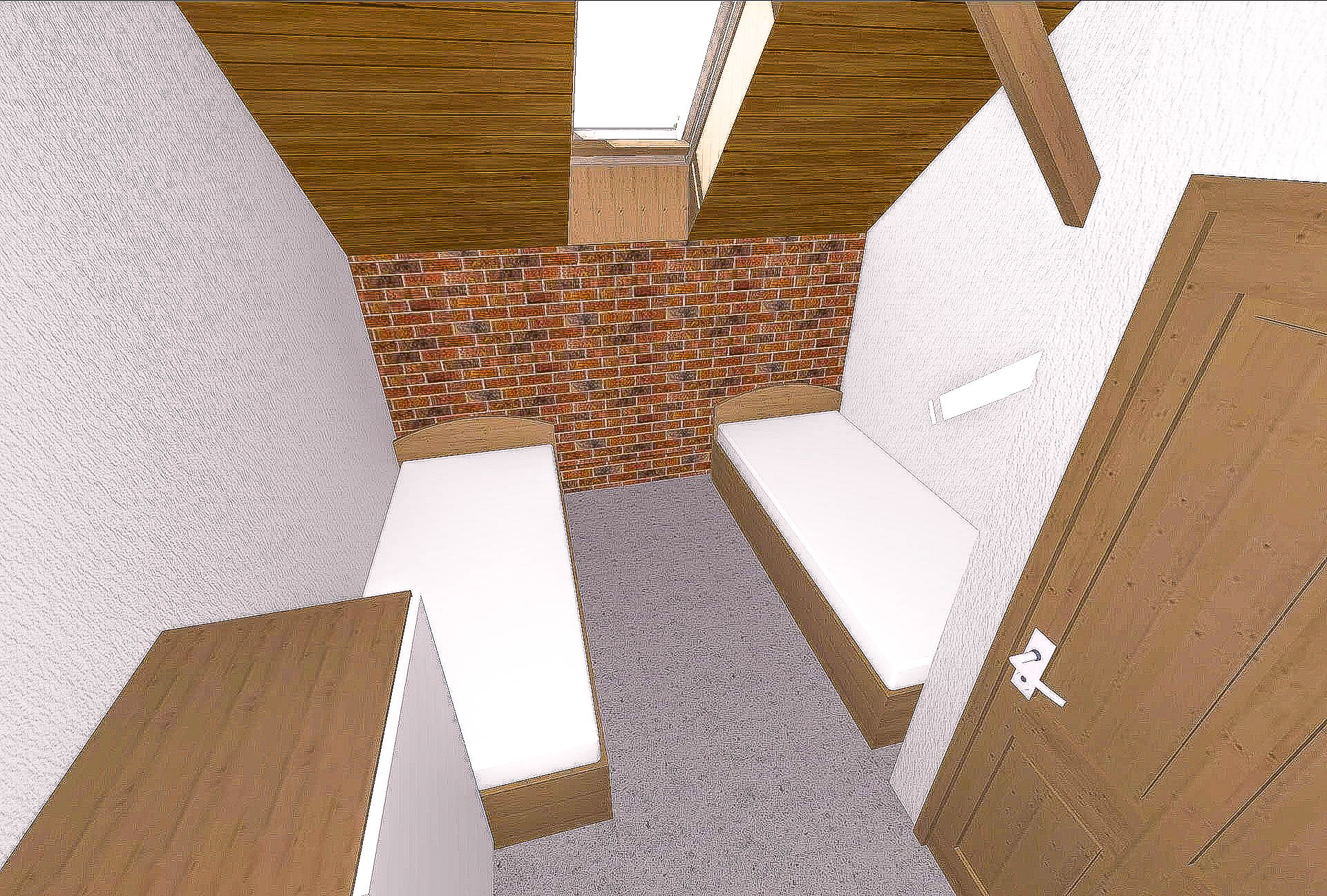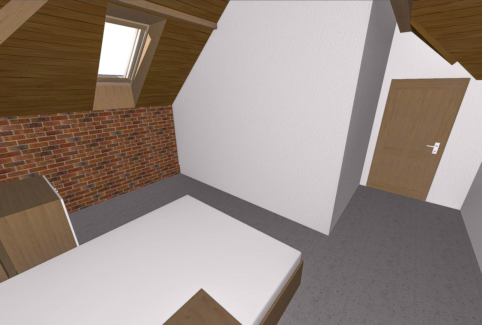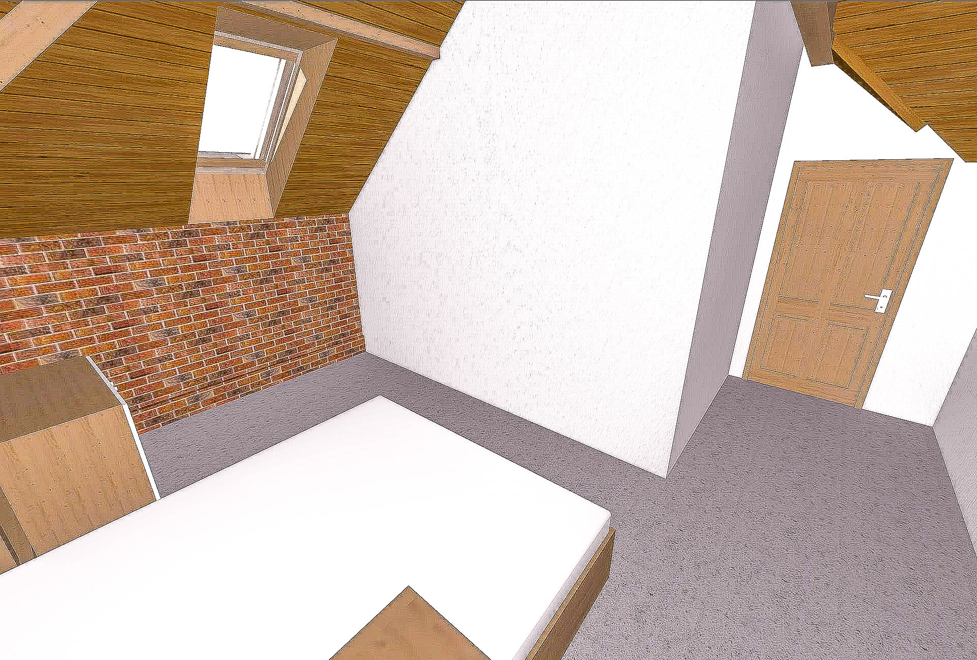 Na severní straně navrhujeme koupelnu s WC a sprchou, využitelnou v létě i pro návštěvy, a také prostor pro saunu nebo komoru. Do podkroví se poté vejde samostatná ložnice a menší pokoj, který v budoucnu - pokud se střecha zateplí - může sloužit jako jednolůžkový i dvoulůžkový pokoj pro hosty.
