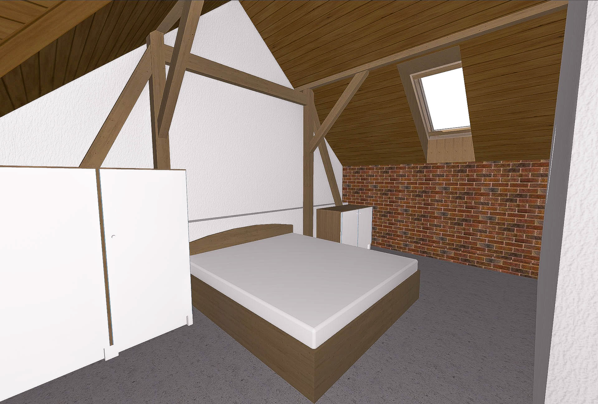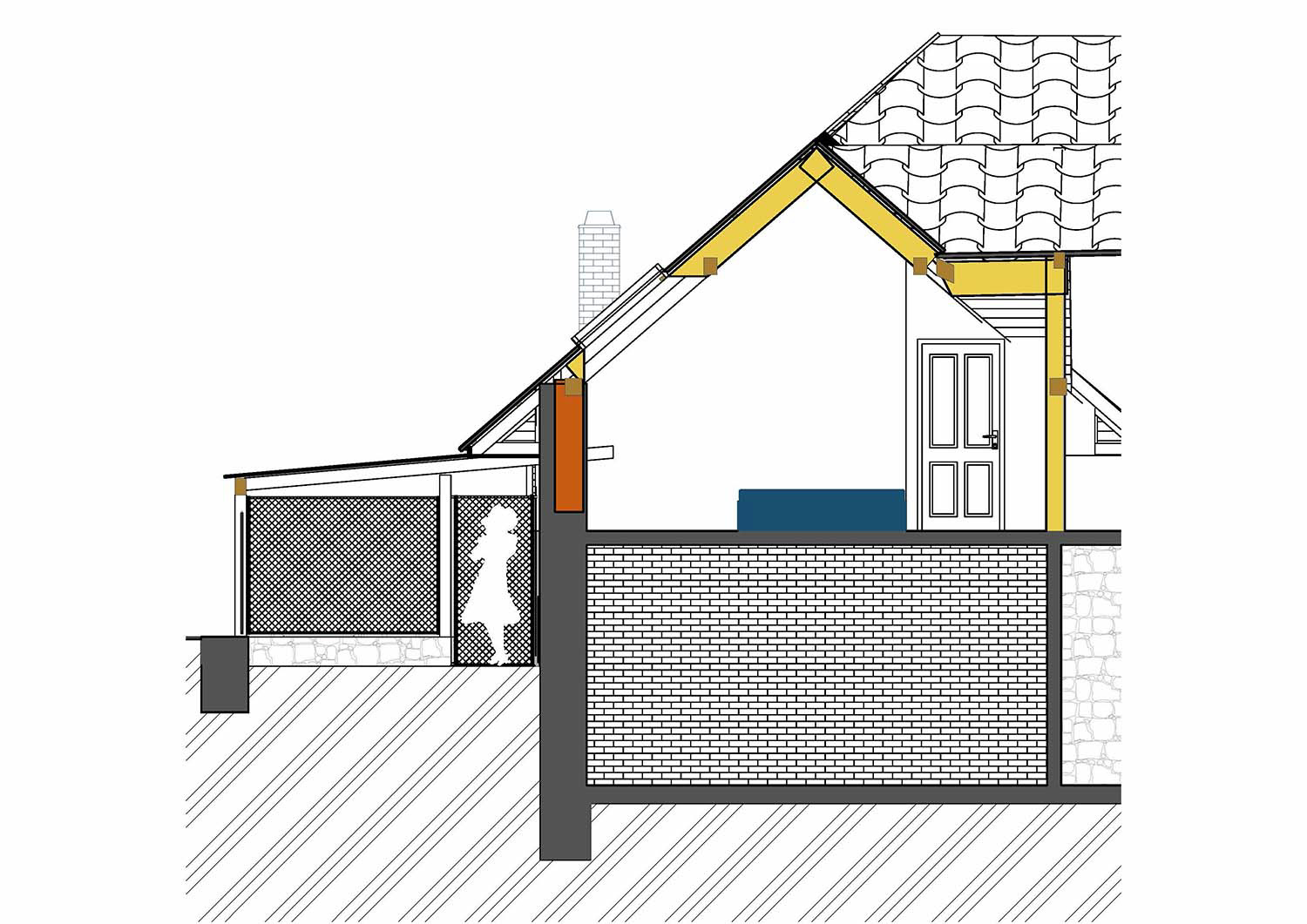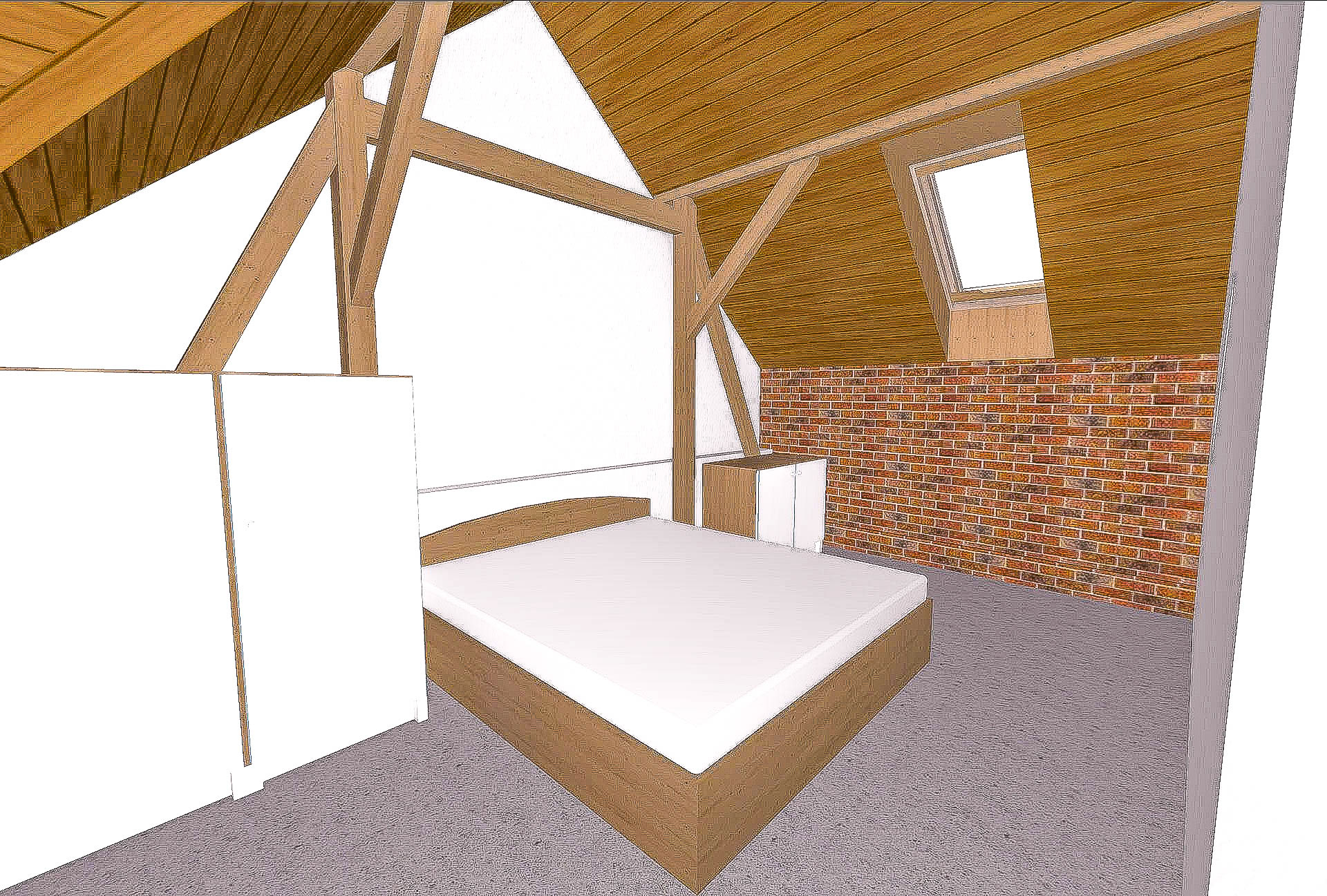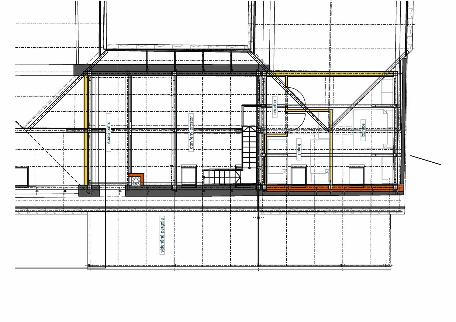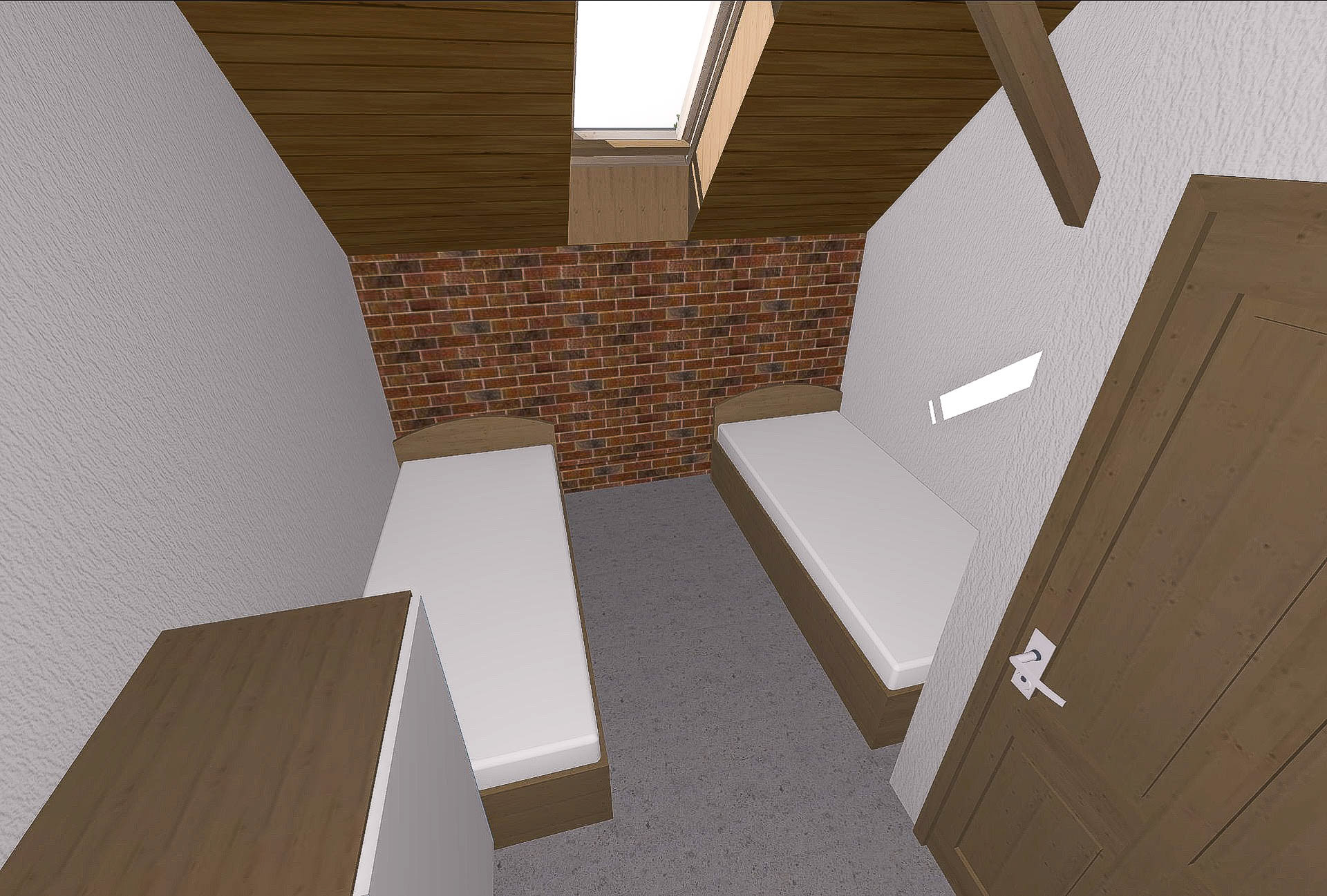 Na severní straně navrhujeme koupelnu s WC a sprchou, využitelnou v létě i pro návštěvy, a také prostor pro saunu nebo komoru. Do podkroví se poté vejde samostatná ložnice a menší pokoj, který v budoucnu - pokud se střecha zateplí - může sloužit jako jednolůžkový i dvoulůžkový pokoj pro hosty.